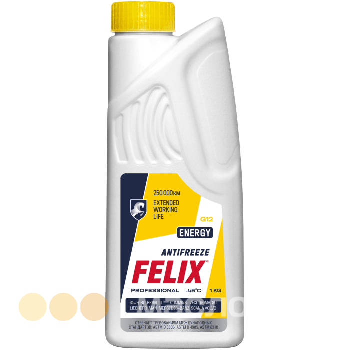 Антифриз Felix Energy — антифриз FELIX® ENERGY представляет собой жидкость охлаждающую низкозамерзающую на основе этиленгликоля высшего сорта и специально очищенной воды, не содержащую аминов, фосфатов, боратов и силикатов. В качестве ингибиторов коррозии содержит пакет органических присадок с добавлением специального компонента для усиленного противодействия коррозии. Предназначен для высоконагруженных двигателей, а также легковых автомобилей, работающих в тяжелых условиях эксплуатации.