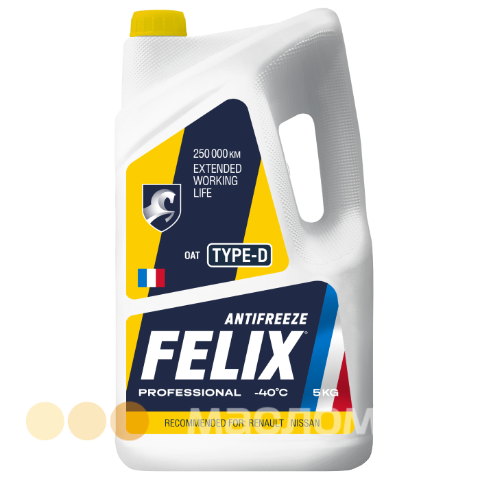 Антифриз FELIX® Type-D представляет собой смесевую композицию на основе водного раствора этиленгликоля, воды и карбоксилатного пакета стабилизирующих и антикоррозионных присадок, содержащих противопенные и красящие добавки. Рекомендован к заливке в автомобили RENAULT, NISSAN.
