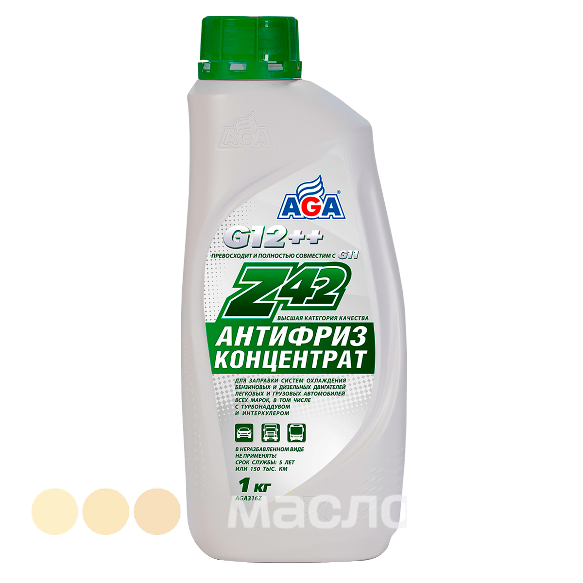 AGA-Z42 – универсальный антифриз высшей категории качества. Концентрат AGA-Z42 предназначен (после разбавления водой) для заправки систем охлаждения бензиновых и дизельных двигателей легковых и грузовых автомобилей всех марок, а также автобусов. Идеален для высокофорсированных двигателей, работающих в тяжелых динамических условиях с частым выходом на высокие обороты коленвала (более 4000 об/мин).